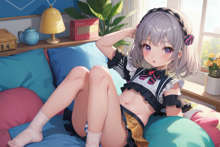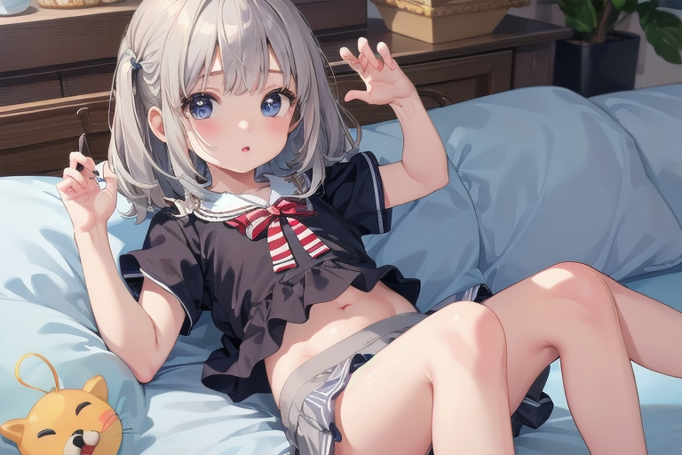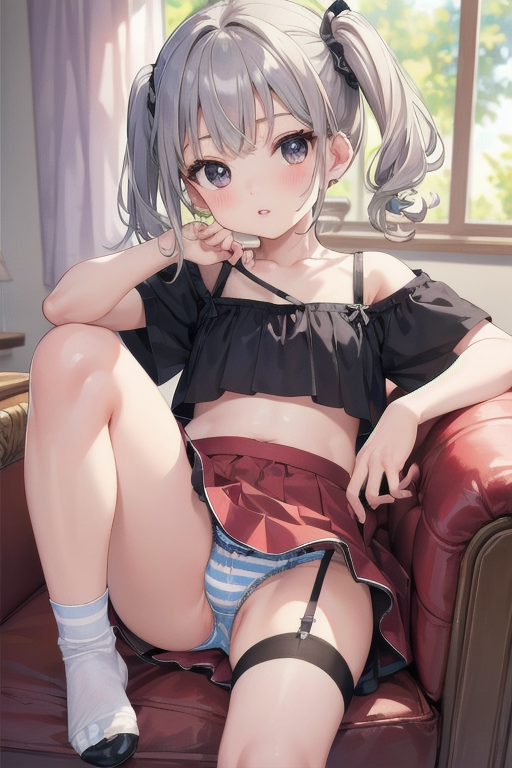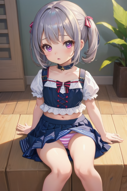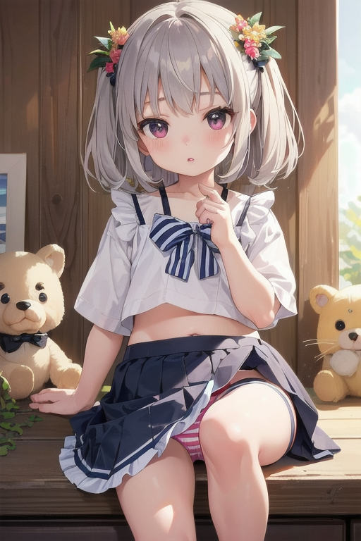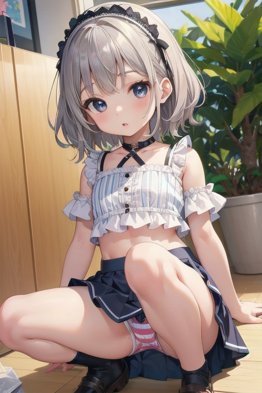 女の子の特徴として、髪がシルバー、貧乳(ちっぱい胸)、服がクロップドトップ、縞々パンツ、スカート、といったところですね。